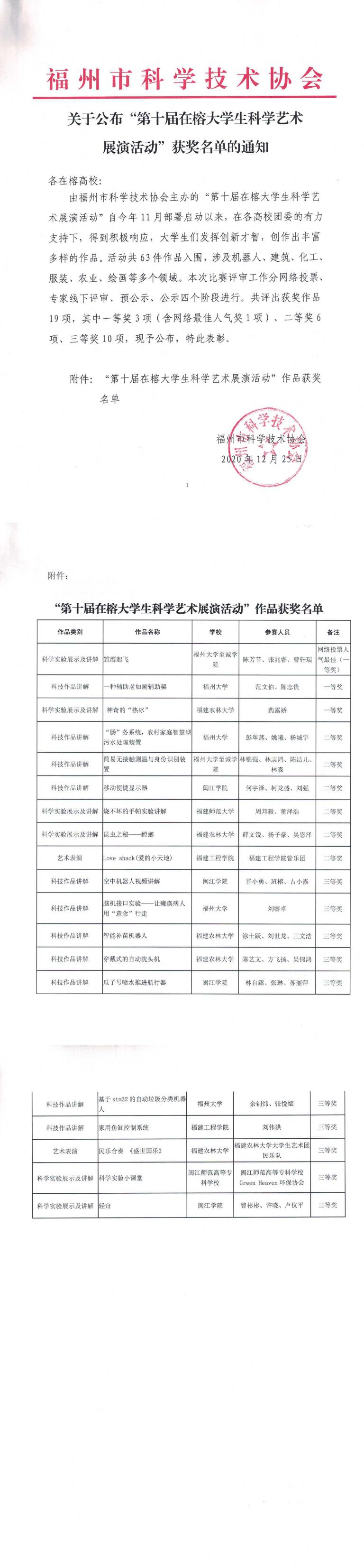 關于公布在榕大學生科學藝術展演活動獲獎名單的通知