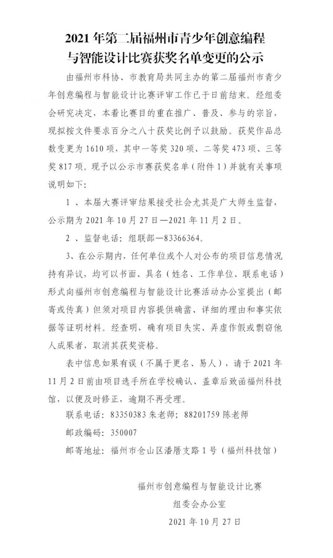 附件1:2021第二屆福州市青少年創意編程與智能設計比賽獲獎名單.xlsx
